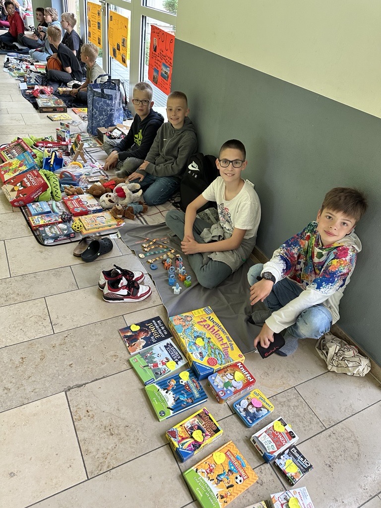 Am letzten Schultag vor den Pfingstferien verwandelte sich die Grundschule Schwarzenbruck in eine bunte und fröhliche Flohmarktfläche. Dort konnten die Schülerinnen und Schüler ihre „Waren“ verkaufen und neue Schätze finden. Viele schöne Spiele, Bücher, Kuscheltiere und Spielzeuge wechselten den Besitzer oder die Besitzerin. Die Kinder hatten große Freude daran, ihre „alten“ Sachen zu verkaufen oder die von anderen neu zu erwerben. Der Flohmarkt diente so auch der Nachhaltigkeit.