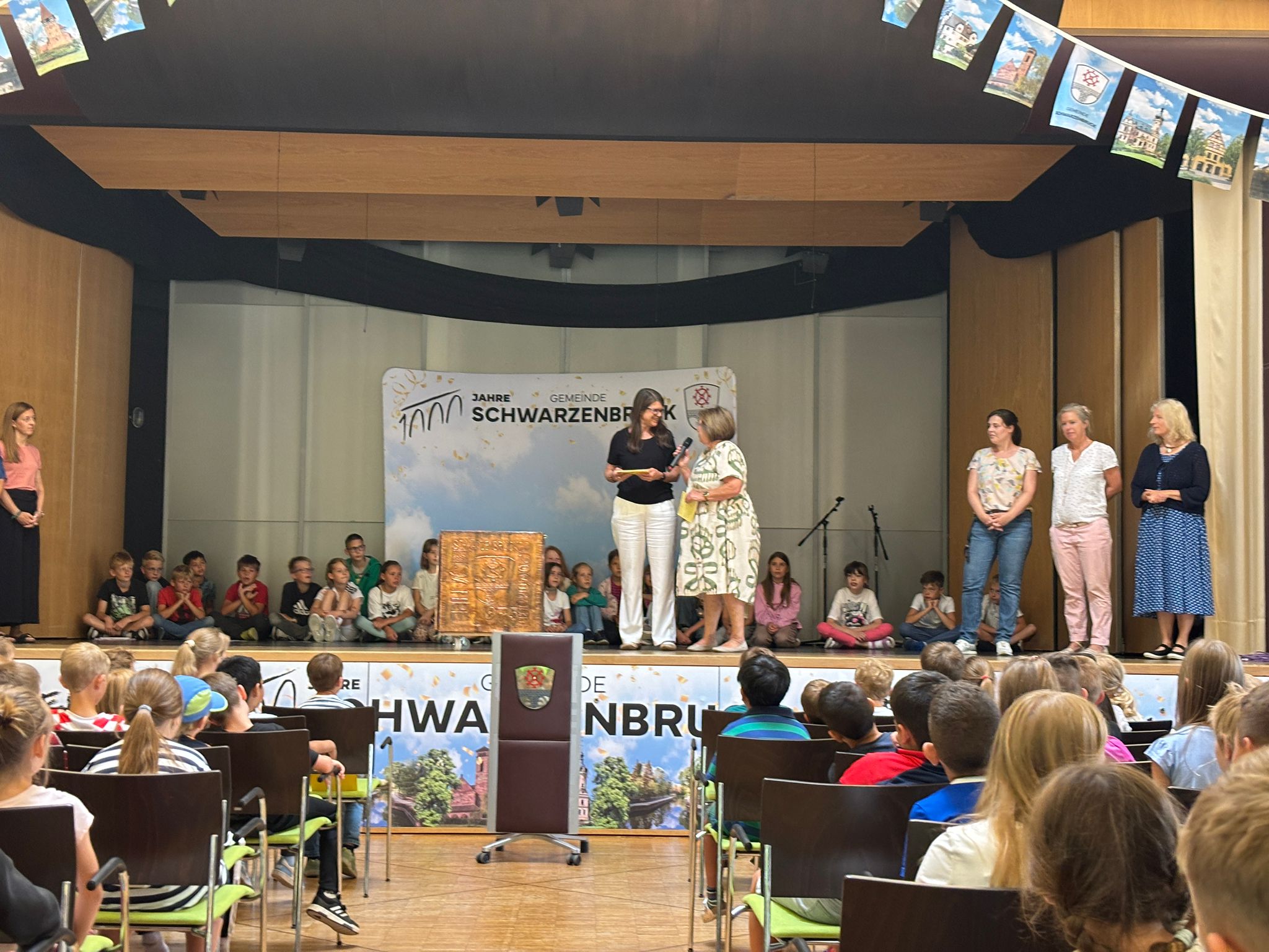 Vor 25 Jahren wurde in Schwarzenbruck die 975 Jahrfeier gefeiert. Damals hat sich das Kollegium der Grund- und Teilhauptschule überlegt, eine „Zeitkapsel“ zu bauen und mit Dingen zu befüllen, die vor 25 Jahren aktuell und wichtig waren. Der damalige Werklehrer Manfred Loy baute aus Holz und Kupferblech einen Würfel, der mit einem Schloss versehen war. Zur 1000 Jahrfeier sollte der Würfel dann geöffnet werden. 25 Jahre lang stand die Zeitkapsel im Archiv der Schule. Der Schlüssel wurde vom damaligen Rektor Hans Herzog an den nächsten Rektor Rainer Sturm übergeben und landete zuletzt bei der Rektorin Sabine Dannich. Diese durfte dann das Geheimnis um die Zeitkapsel lüften. In der vollen Bürgerhalle warteten 290 Schüler, alle Lehrer, der Bürgermeister Herr Holzammer, der ehemalige Bürgermeister Bernd Ernstberger, der ehemalige Schulleiter Rainer Sturm, Martin Glienke und viele ehemalige Lehrer auf den großen Moment. Zuerst präsentierte noch die Klasse 4c ihr Lied „Tausend Jahre Schwarzenbruck“, welches sie extra für das große Fest gedichtet hatte. Dann war es endlich so weit. Ob der Schlüssel passte? Quietschend öffnete sich die Truhe. Die Kinder fanden ein Theaterstück der 975 Jahrfeier, bunte Plakate mit Wünschen für ihre Zukunft, Hefte mit Geschichten und Gedichten, ein Stück von der Berliner Mauer und viele andere Exponate. Besonders ergreifend war für die Kinder, dass einige ehemalige Lehrer ihre Werke, die sie mit den Klassen vor 25 Jahren erstellt hatten, selber präsentierten und erklärten. Auch zwei ehemalige Schüler waren dabei und erzählten, wie sie ihre Bildermappe damals angefertigt hatten.